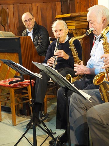Debout à gauche Claude Abadie (cl), au centre Jean-François Higounet (tp), à sa droite Albert Glowinski (dm) devant au centre Claude Tissendier (as) , Temple protestant de Meudon, 21 octobre 2012 © Laurent Coste, by courtesy
